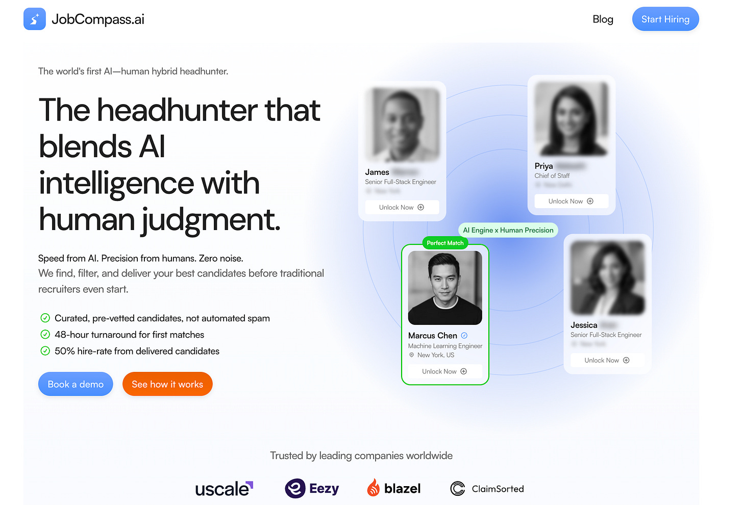 Job Compass positions itself as an AI-human hybrid headhunter.